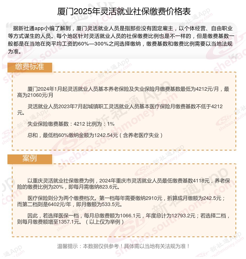 据新社通app数据显示,厦门灵活就业人员养老保险缴费基数2024-2025年最新标准如下: