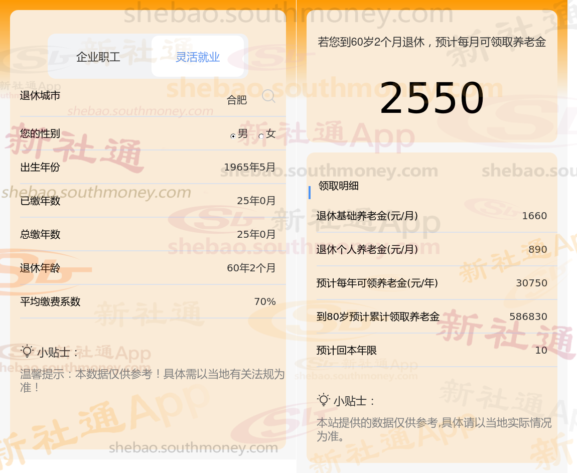 吕某,作为一位有着25年缴费年限的退休者,其缴费档次一直保持在较高的70%水平。基于这些条件,我们使用了新社通app养老金计算器来为他做一个大致的估算: