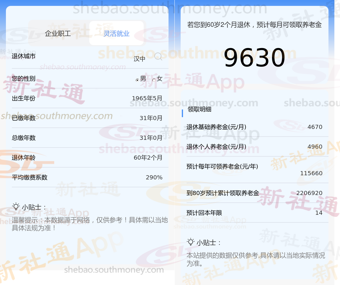 王某,男,1965年出生,现居汉中并已退休。其养老保险缴纳情况如下:总缴费年限为31年,缴费档次达到290%。根据新社通app养老金计算器的估算结果: