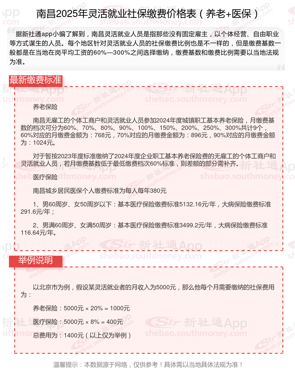 据新社通app数据显示,南昌灵活就业养老保险缴费基数2024-2025年最新标准如下:
