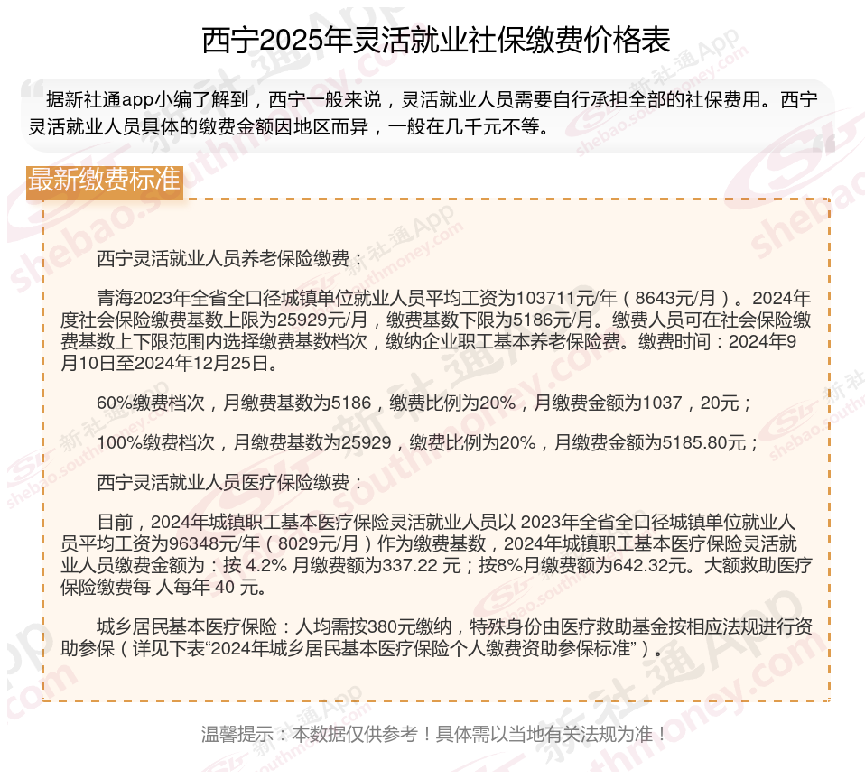 那么,西宁个人社保一个月多少钱?根据新社通app-社保缴费查询工具提供的2025社保缴费标准详情数据: