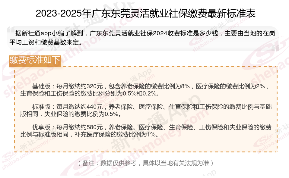 据新社通app数据显示,广东东莞灵活就业养老保险缴费基数2024-2025年最新标准如下: