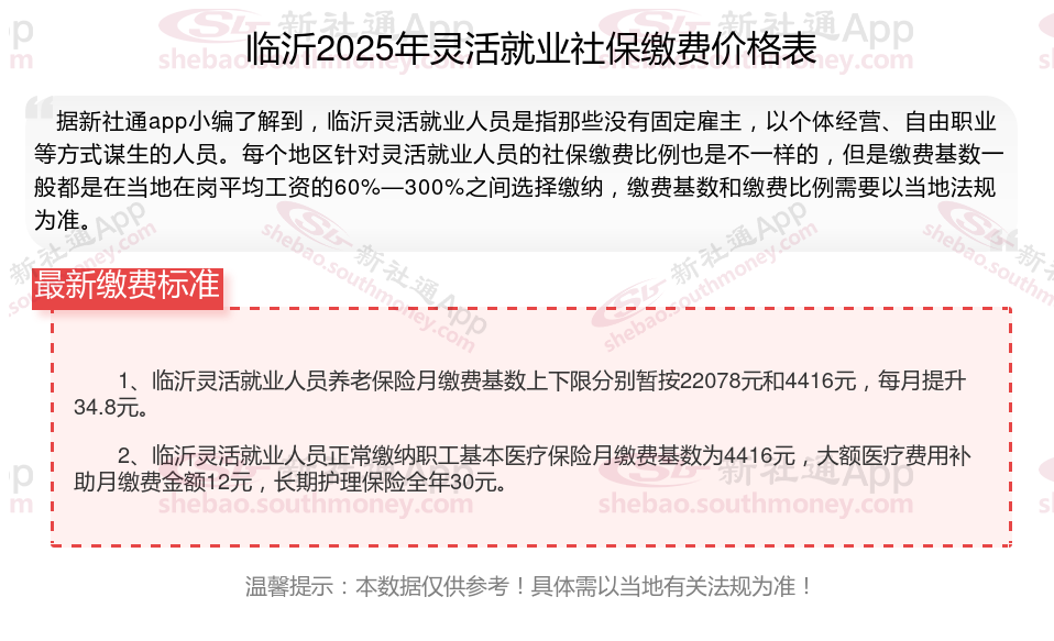 据新社通app数据显示,临沂灵活就业养老保险缴费基数2024-2025年最新标准如下:
