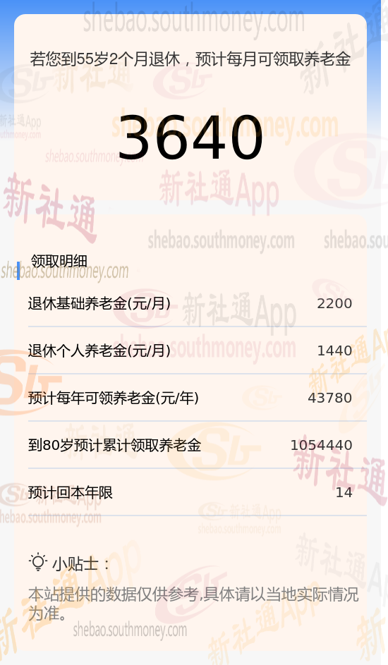 总养老金金额:两者合计,您每月可领取的养老金总额为3640元/月。