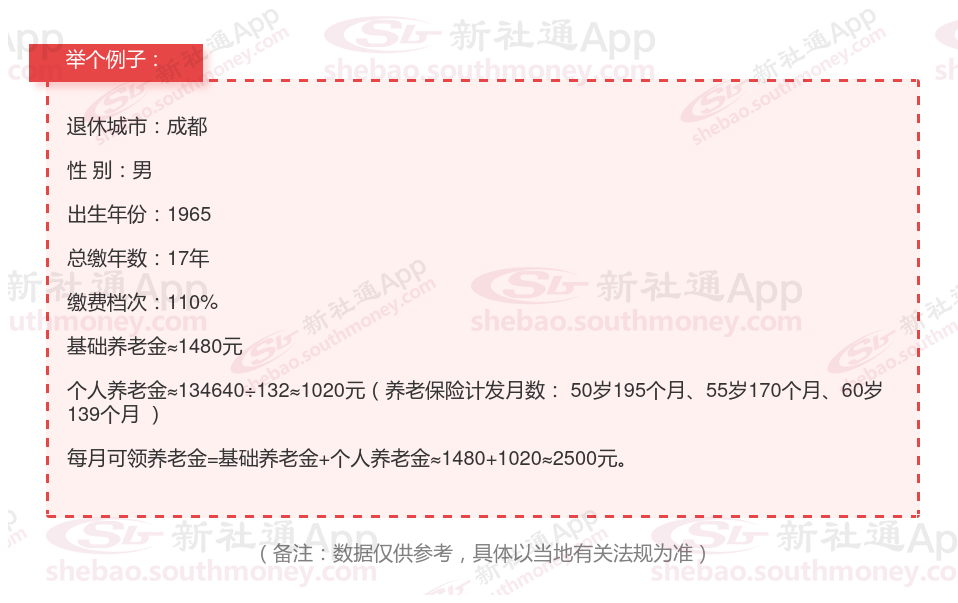 退休城市:成都,性别:男,出生年份:1965,总缴年数17年,缴费档次:110%,新社通app养老金计算器所得: