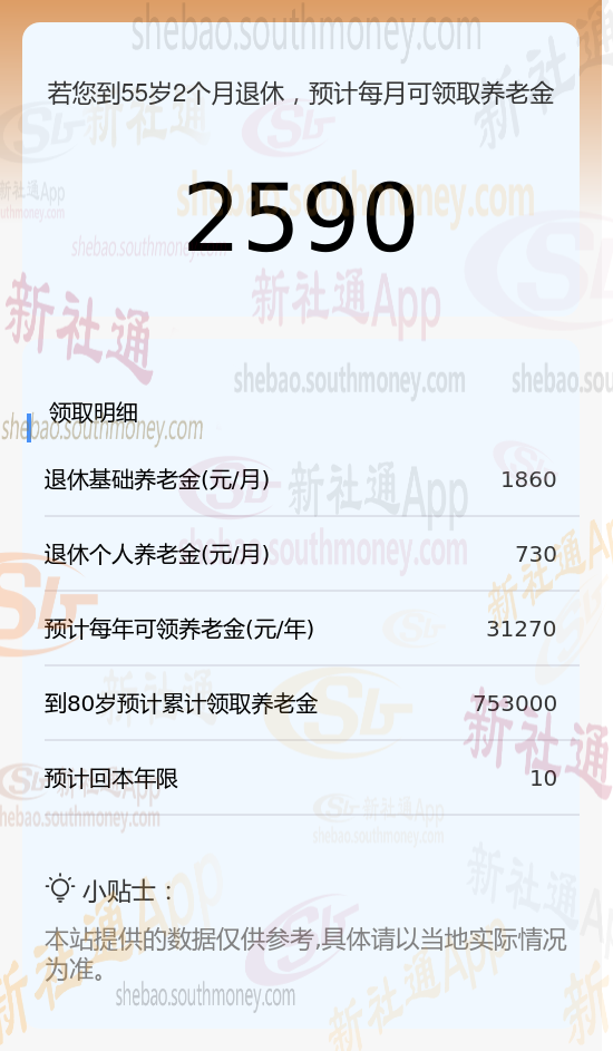 每月可领养老金总额:将基础养老金与个人养老金相加,每月可领取的养老金总额约为2590元(1860元+730元)。