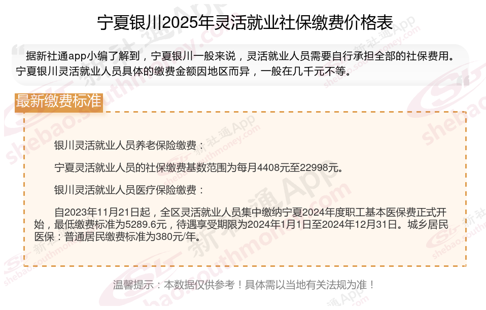 据新社通app数据显示,宁夏银川企业灵活就业养老保险的缴费基数为:5070元。