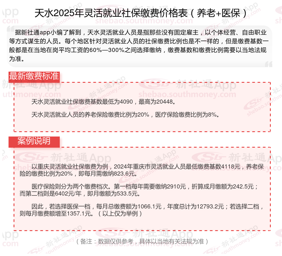 据新社通app数据显示,天水企业灵活就业养老保险的缴费基数为:4317元。