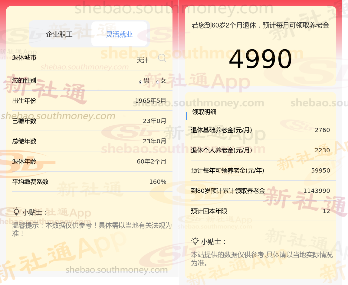 退休城市:天津,性别:男,出生年份:1965,总缴年数23年,缴费档次:160%,新社通app养老金计算器所得: