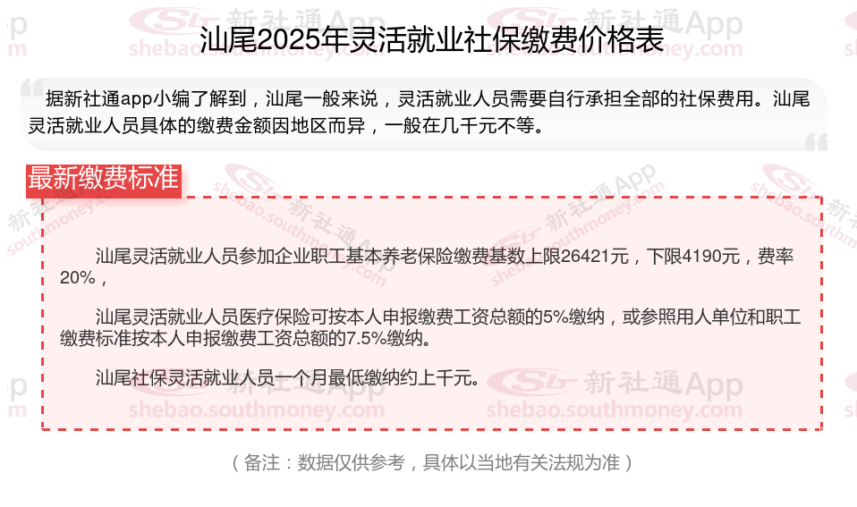 那么,汕尾灵活就业者社保一个月多少钱?根据新社通app-社保缴费查询工具提供的2025社保缴费标准详情数据: