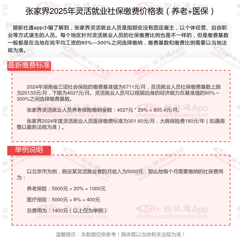 据新社通app数据显示,2024-2025年张家界灵活就业人员养老保险的缴费标准: