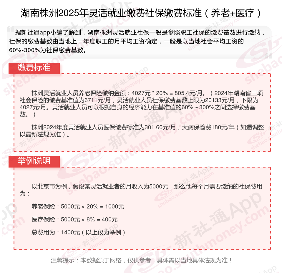 据新社通app数据显示,湖南株洲灵活就业人员养老缴费基数2024-2025年最新标准如下: