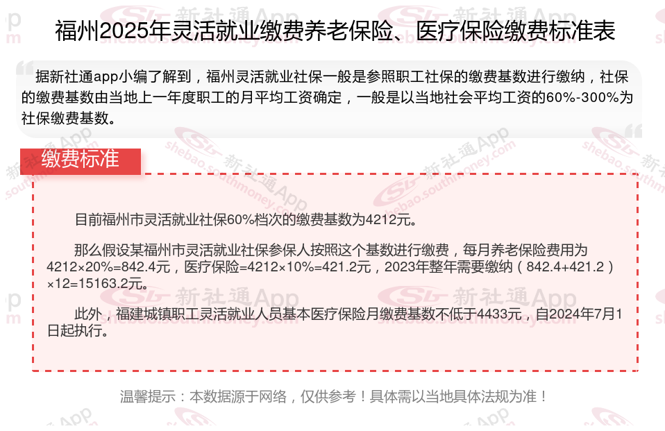 此外,福建城镇职工灵活就业人员基本医疗保险月缴费基数不低于4433元,自2024年7月1日起执行。