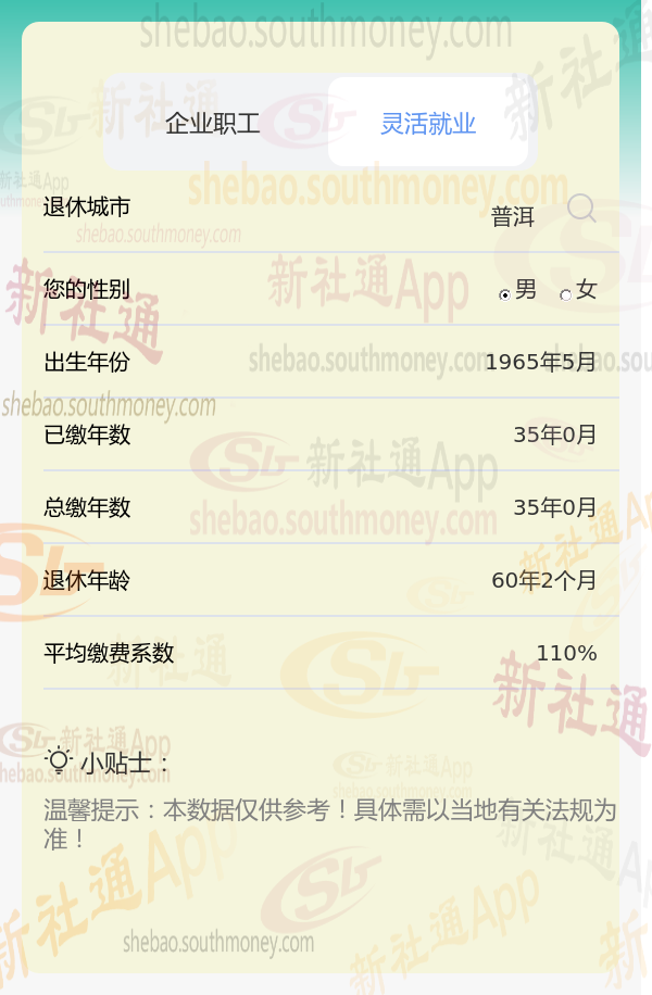 云南普洱35年基础退休工资:基本养老金计算公式为:(退休时上年度全市城镇单位就业人员月平均工资+本人指数化月平均缴费工资)÷2×缴费年限×1%。通过公式计算出每月大约3000元。