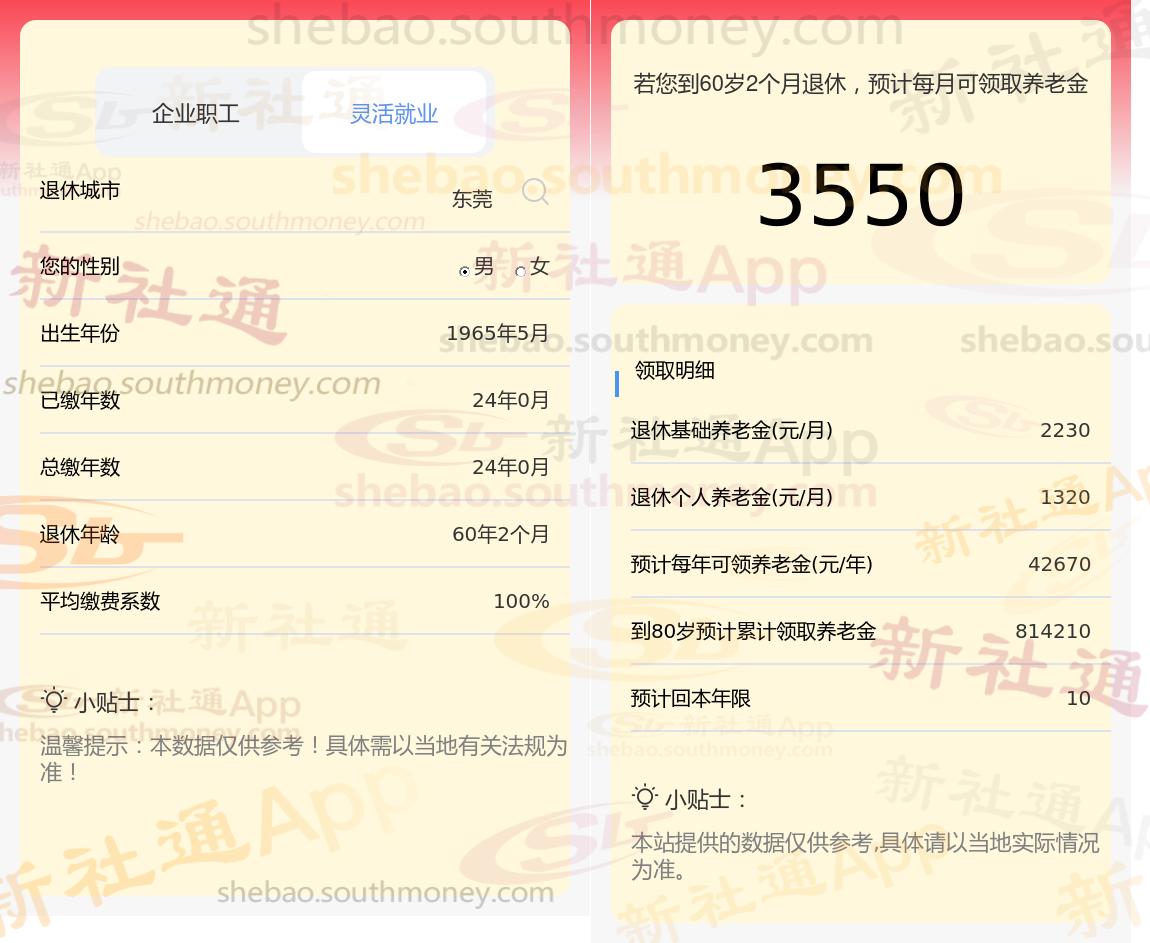 退休城市:广东东莞,性别:男,出生年份:1965,总缴年数24年,缴费档次:100%,新社通app养老金计算器所得:
