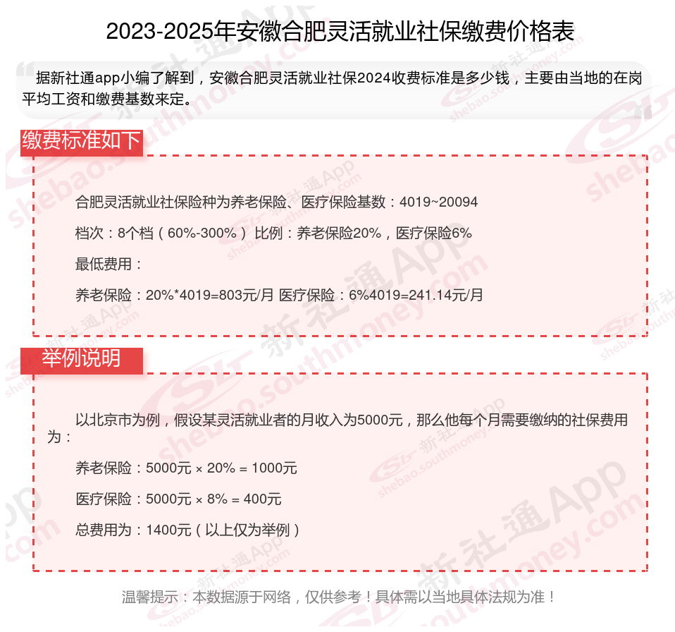 安徽合肥社保缴费多少钱?下表是2024-2025年安徽合肥社保费用明细参考,根据新社通app-社保缴费查询工具提供的最新数据如下: