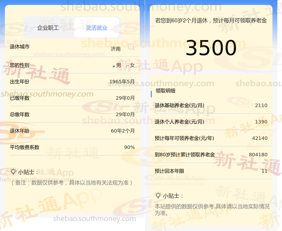退休城市:济南,性别:男,出生年份:1965,总缴年数29年,缴费档次:90%,新社通app养老金计算器所得: