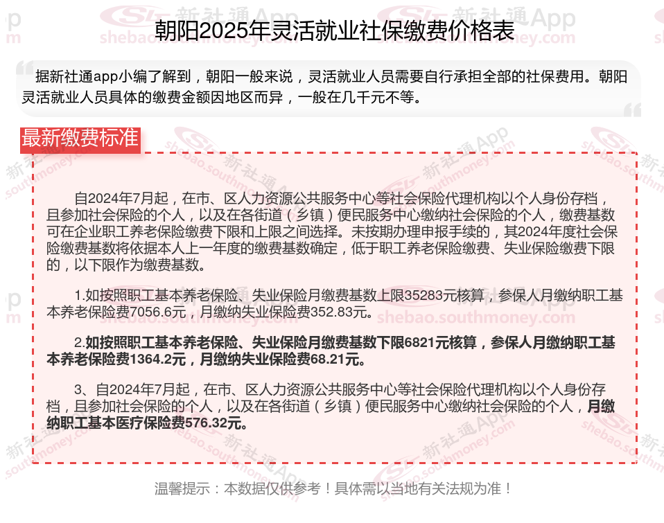 据新社通app数据显示,朝阳灵活就业养老缴费基数明细如下: