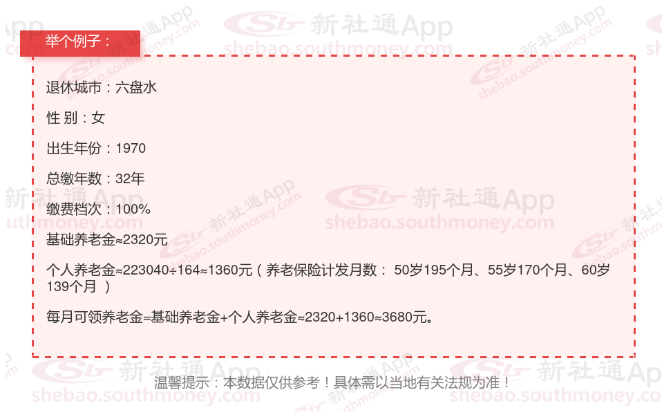 总养老金月度领取额:将基础养老金和个人养老金相加,得出每月可领取的养老金总额大约为3680元(即2320元基础养老金+1360元个人养老金)。