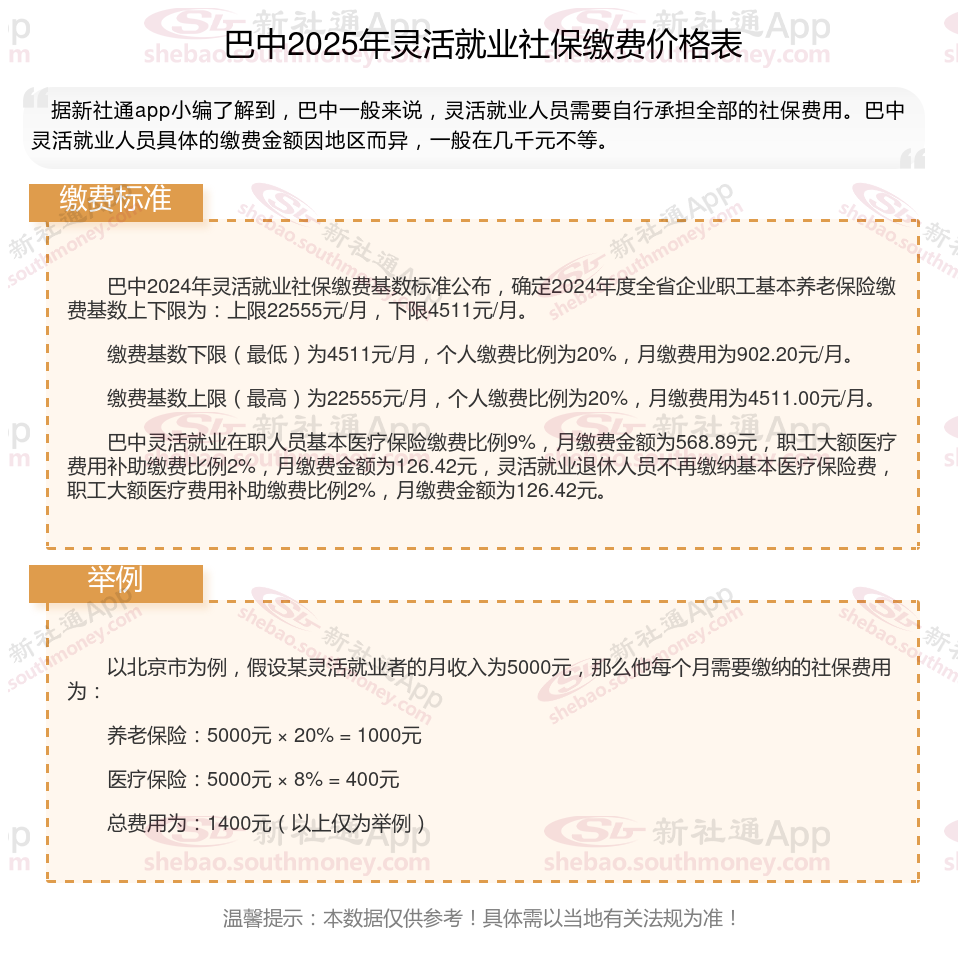 据新社通app数据显示,巴中灵活就业养老保险缴费基数2024-2025年最新标准如下:
