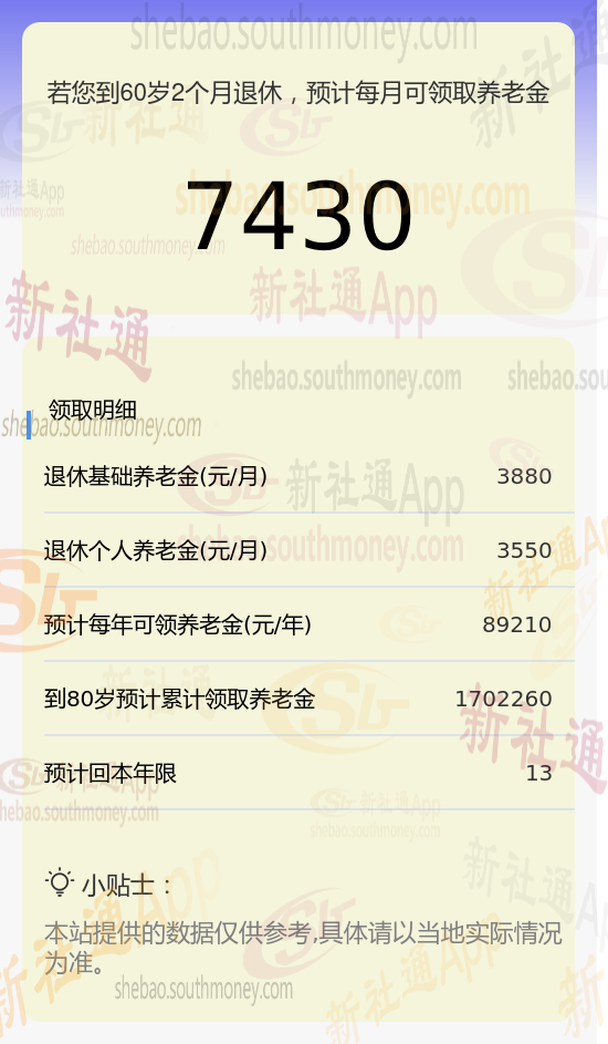 每月可领养老金总额:将基础养老金与个人养老金相加,每月可领取的养老金总额约为7430元(3880元+3550元)。