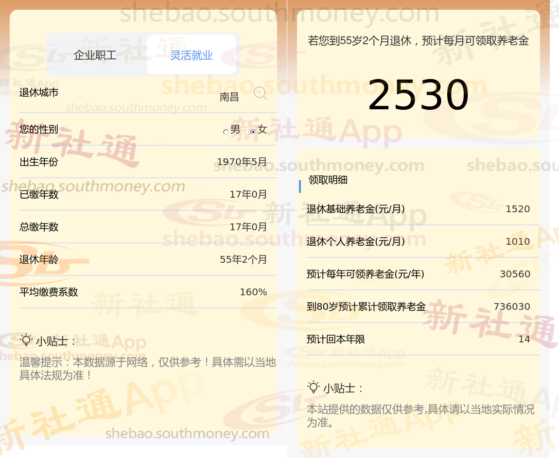 退休城市:江西南昌,性别:女,出生年份:1970,总缴年数17年,缴费档次:160%,新社通app养老金计算器所得: