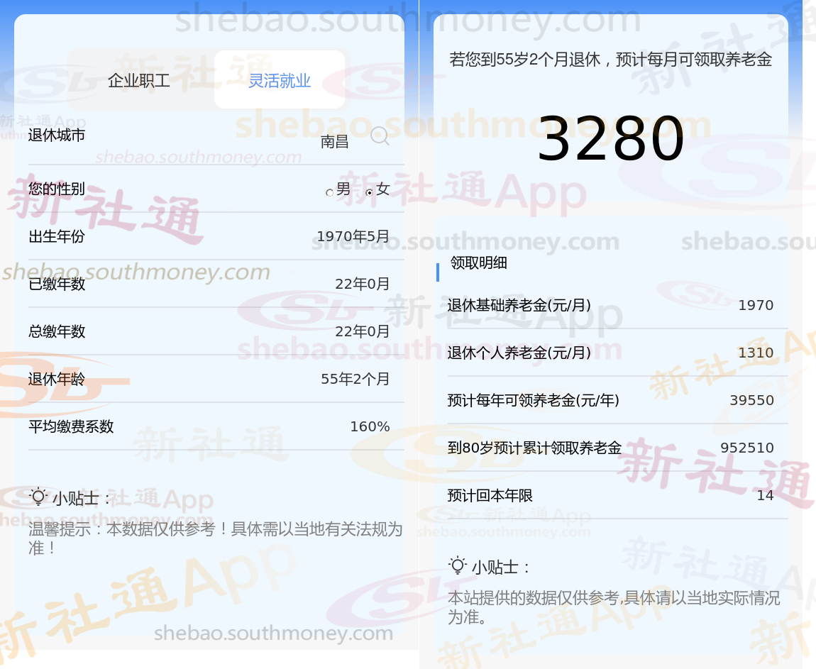 退休城市:南昌,性别:女,出生年份:1970,总缴年数22年,缴费档次:160%,新社通app养老金计算器所得: