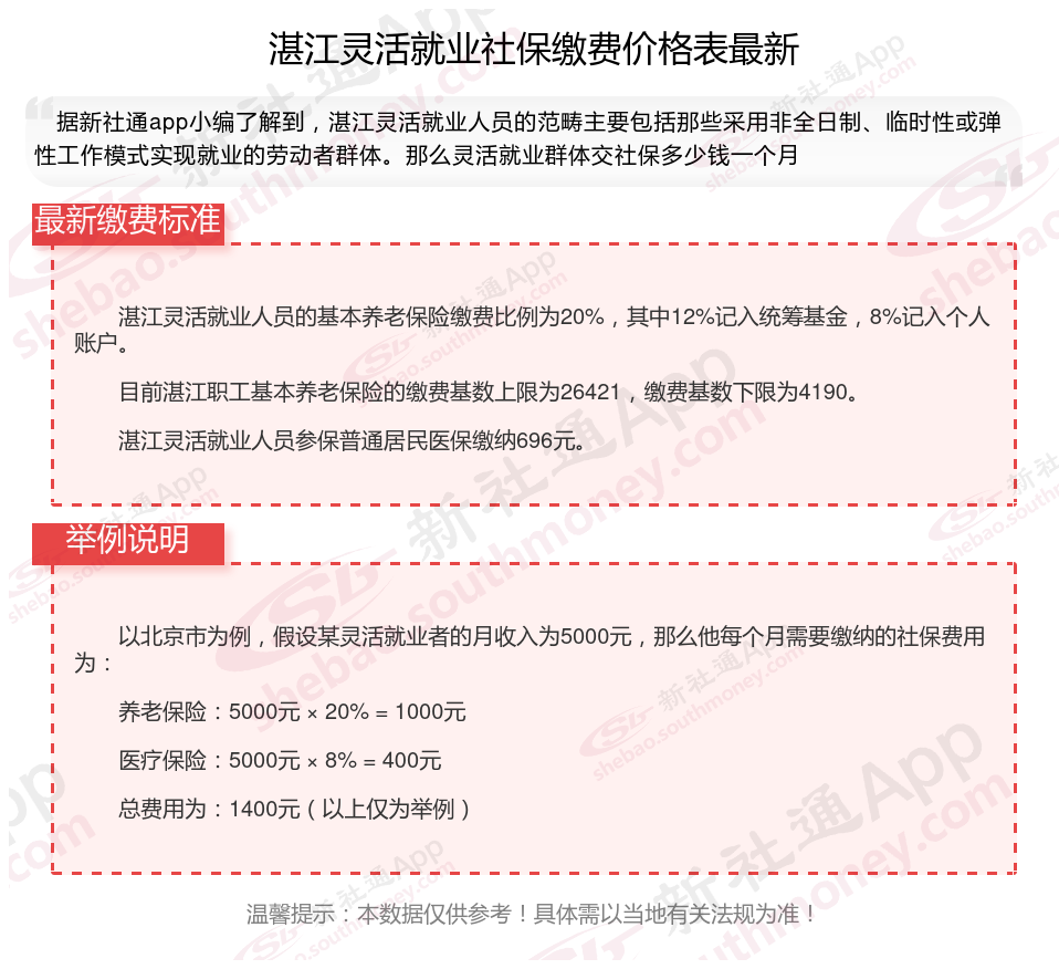 据新社通app数据显示,2024-2025年湛江灵活就业人员养老保险的缴费标准是根据缴费基数来确定的:
