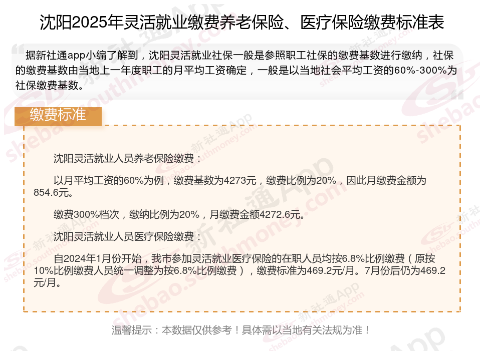 据新社通app数据显示,沈阳灵活就业养老保险的缴费基数为:4273元。灵活就业人员参保缴费的比例为个人20%。