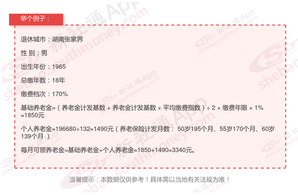 退休城市:湖南张家界,性别:男,出生年份:1965,总缴年数18年,缴费档次:170%,新社通app养老金计算器所得: