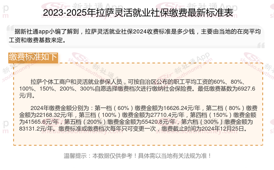 那么,拉萨灵活就业者社保一个月多少钱?根据新社通app-社保缴费查询工具提供的2025社保缴费标准详情数据: