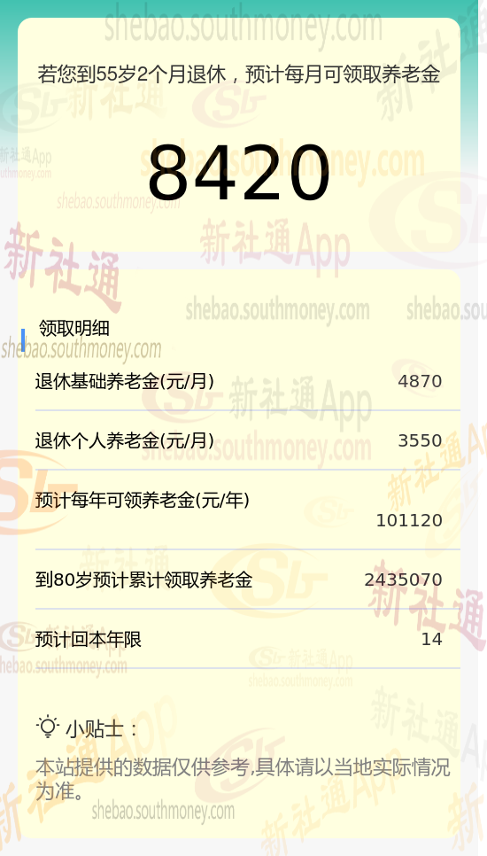 现在,我们来计算一下每月可领取的养老金总额。只需将基础养老金的4870元与个人养老金的3550元相加,得到的总数就是每月可以领取的养老金,大约是8420元。这个数字象征着您退休后每月可以期待的一笔稳定收入。