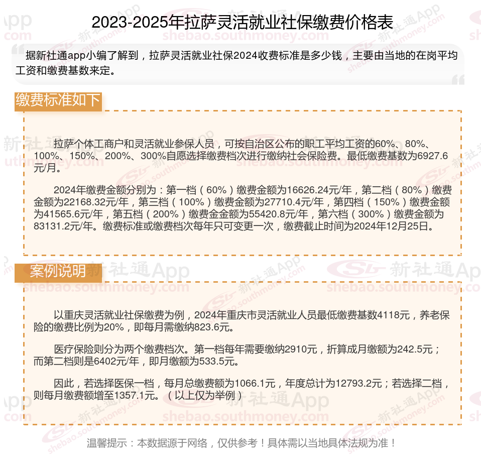 据新社通app数据显示,拉萨灵活就业人员养老缴费基数2024-2025年最新标准如下:
