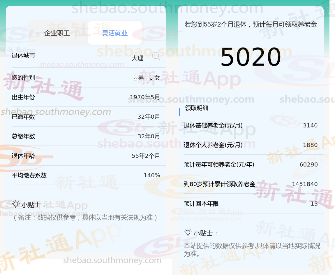 同事孔某退休城市在大理,性别:女,出生年份:1970,总缴年数32年,缴费档次:140%,新社通app养老金计算器所得: