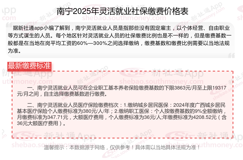 据新社通app数据显示,南宁灵活就业养老保险缴费基数2024-2025年最新标准如下: