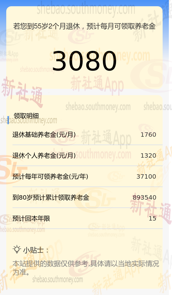 每月可领养老金总额:将基础养老金与个人养老金相加,每月可领取的养老金总额约为3080元(1760元+1320元)。