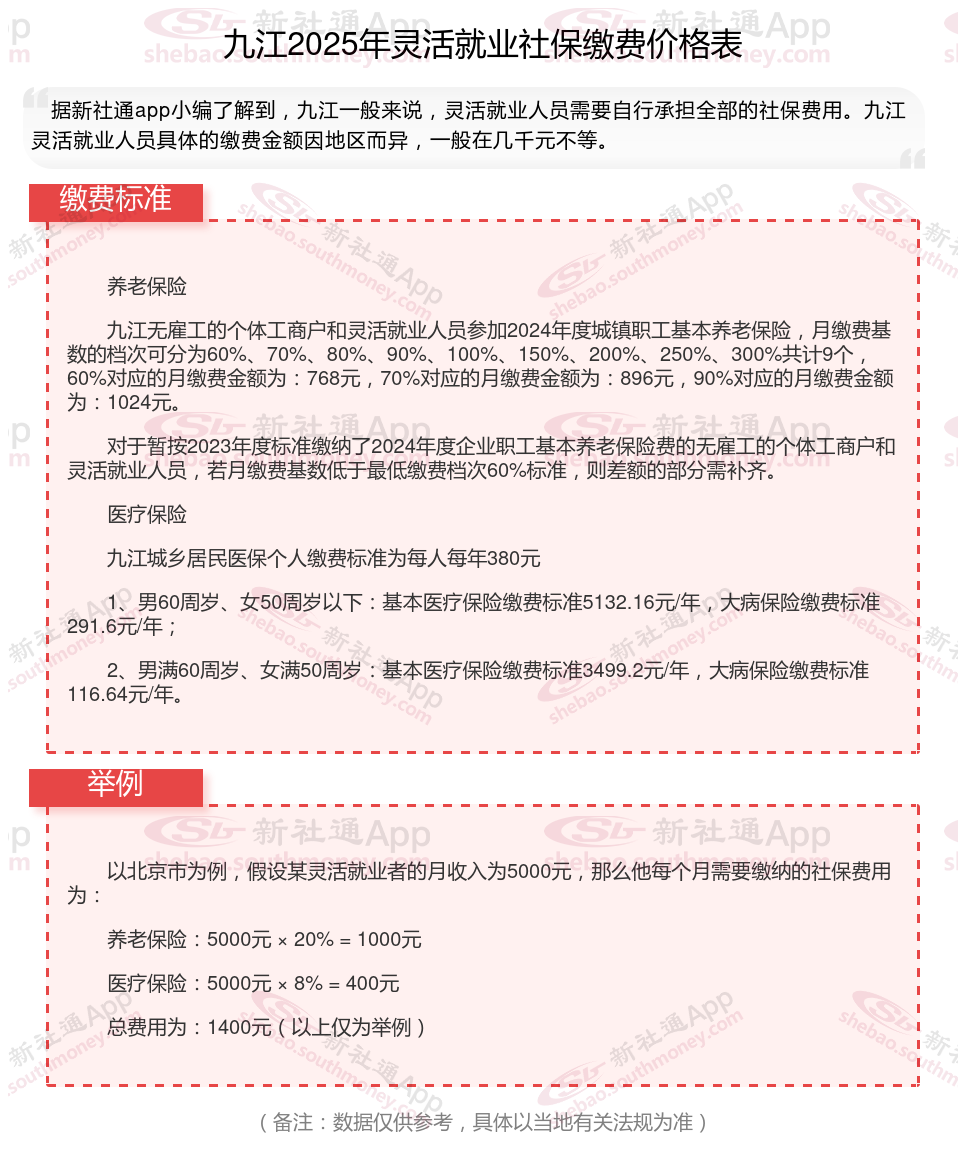 据新社通app数据显示,2024-2025年九江灵活就业人员养老保险的缴费标准是根据缴费基数来确定的: