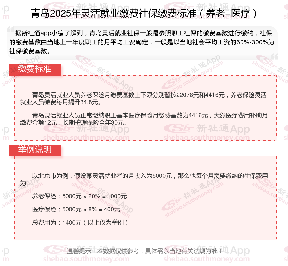 青岛灵活就业人员养老保险月缴费基数上下限分别暂按22078元和4416元,养老保险灵活就业人员缴费每月提升34.8元。
