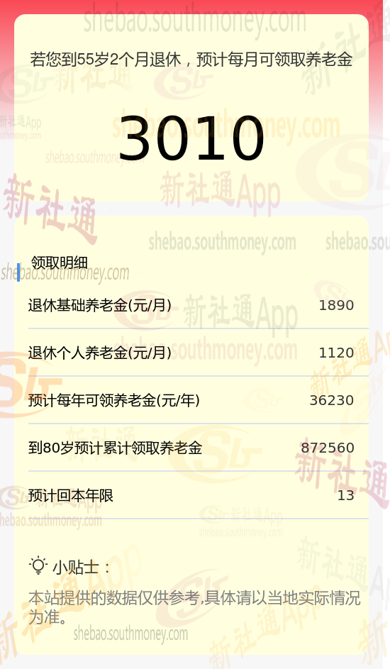 新社通app养老金计算器计算所得: