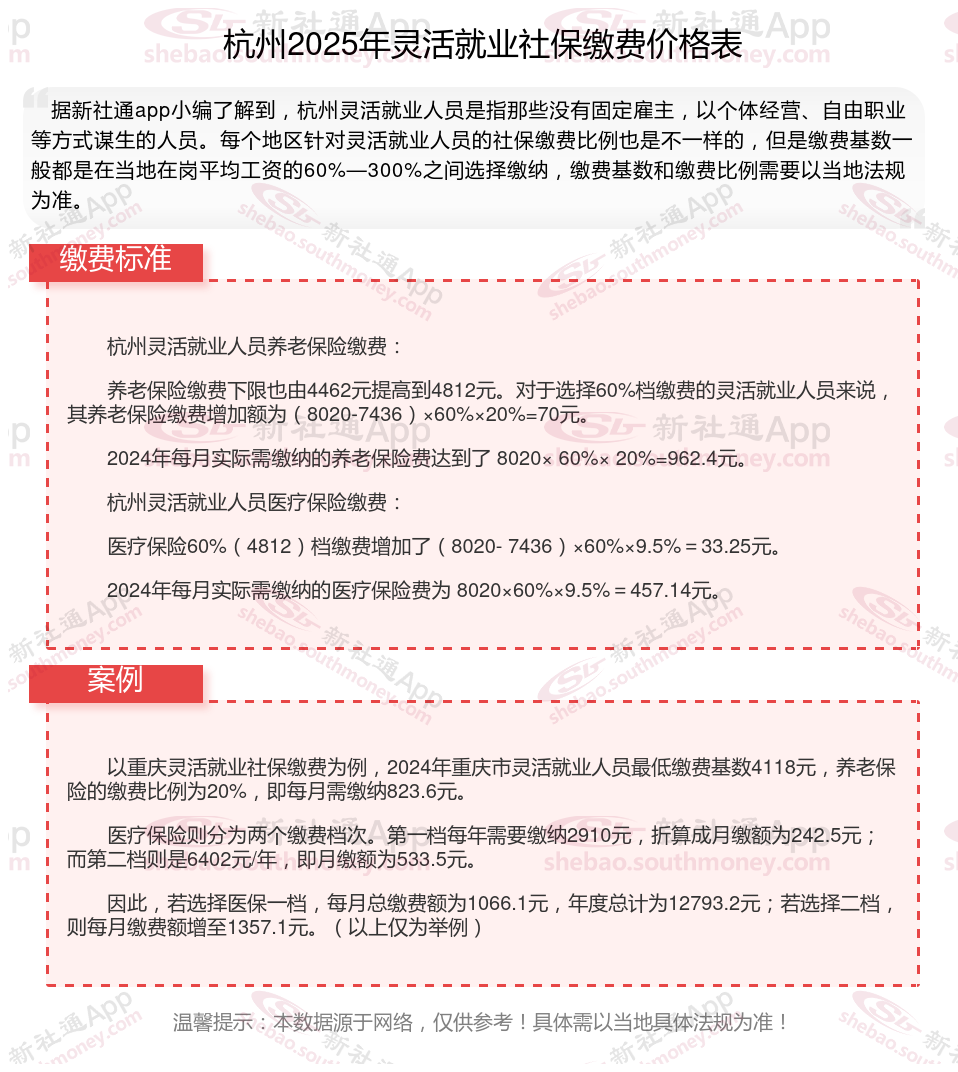 据新社通app数据显示,杭州灵活就业养老缴费基数明细如下: