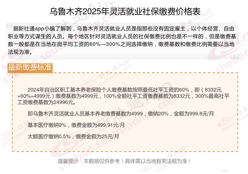 2025年乌鲁木齐城镇职工社会保险缴费基数用人单位及其职工(包括有雇工的个体工商户及其雇工)分别按2024年度全口径省平的60%(4999元/月)和300%(24996元/月)核定缴费基数的下限和上限执行。