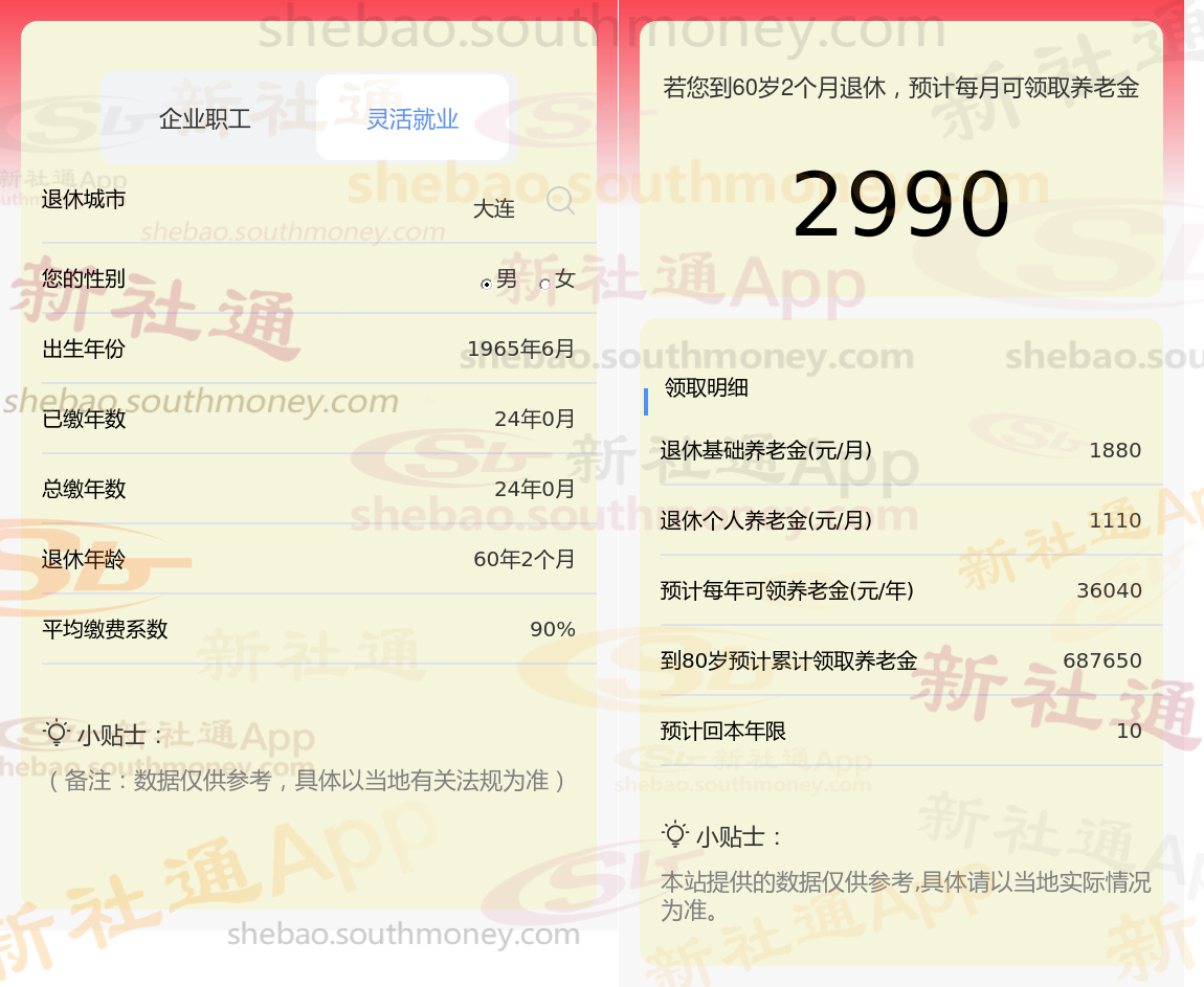 退休城市:大连,性别:男,出生年份:1965,总缴年数24年,缴费档次:90%,新社通app养老金计算器所得: