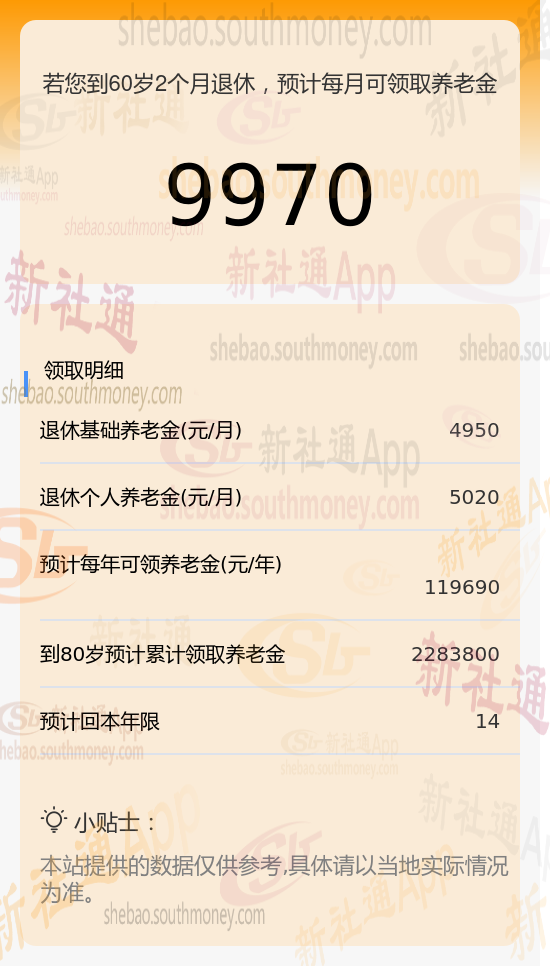 新社通app养老金计算器所得出,每月领取9970元养老金。
