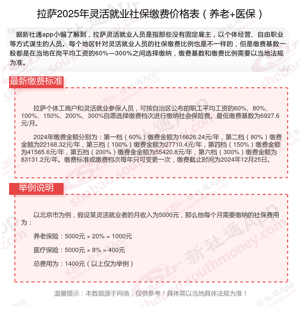 据新社通app数据显示,拉萨企业灵活就业养老保险的缴费基数为:6927.6元。