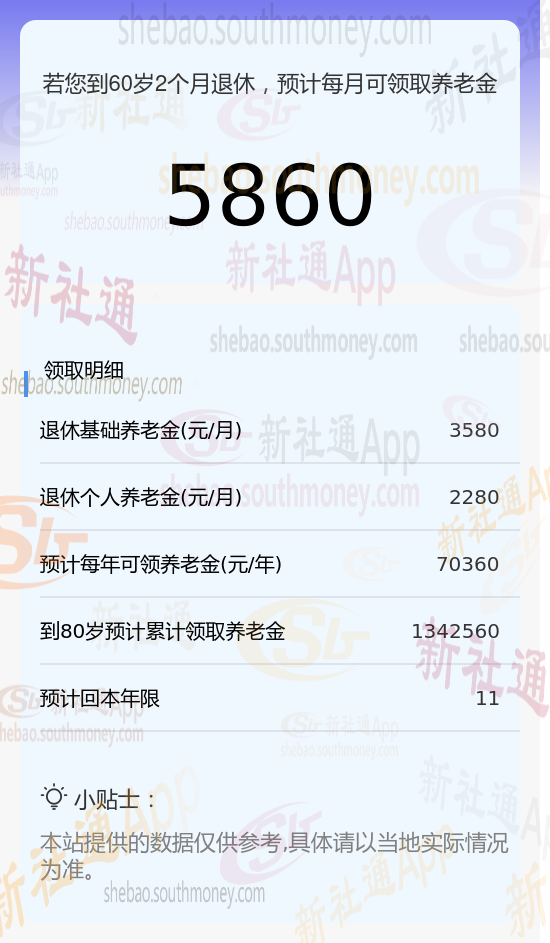 现在,我们来计算一下每月可领取的养老金总额。只需将基础养老金的3580元与个人养老金的2280元相加,得到的总数就是每月可以领取的养老金,大约是5860元。这个数字象征着您退休后每月可以期待的一笔稳定收入。