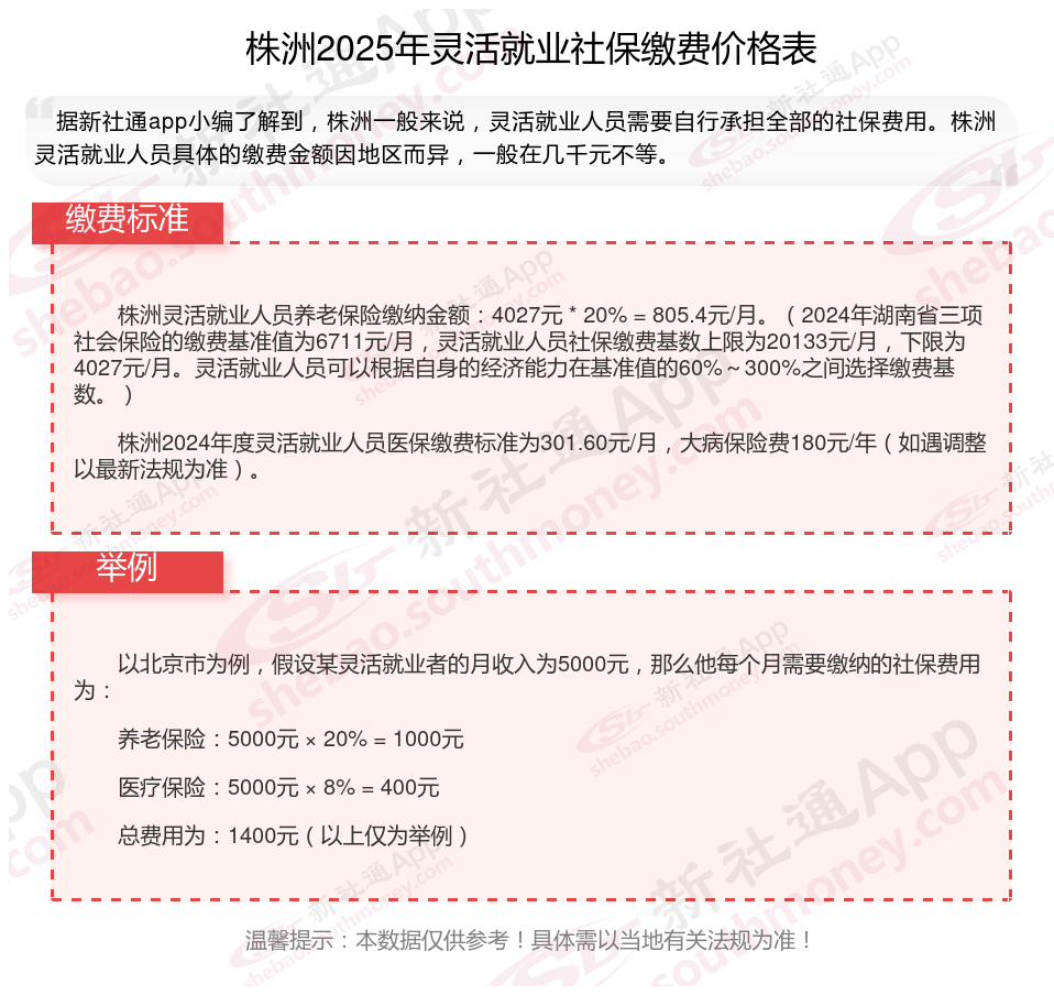 据新社通app数据显示,株洲灵活就业养老保险的缴费基数为:4027元。灵活就业人员参保缴费的比例为个人20%。