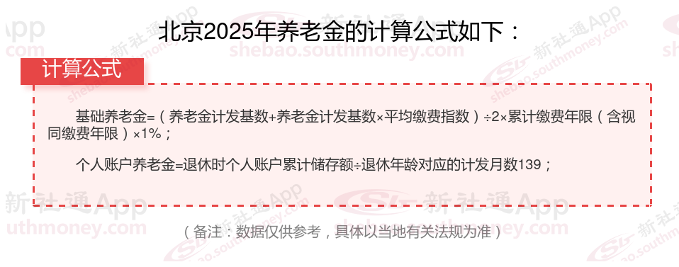 基本养老金=(退休时上年度全市城镇单位就业人员月平均工资+本人指数化月平均缴费工资)÷2×缴费年限×1%。