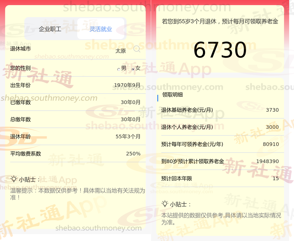 基础养老金:其计算公式为(全省上年度在岗职工月平均工资+本人指数化月平均缴费工资)÷2×缴费年限×1%。其中,本人指数化月平均缴费工资=全省上年度在岗职工月平均工资×本人平均缴费指数(本人平均缴费指数最高为300%,最低为60%,指数在0.6~3之间)。