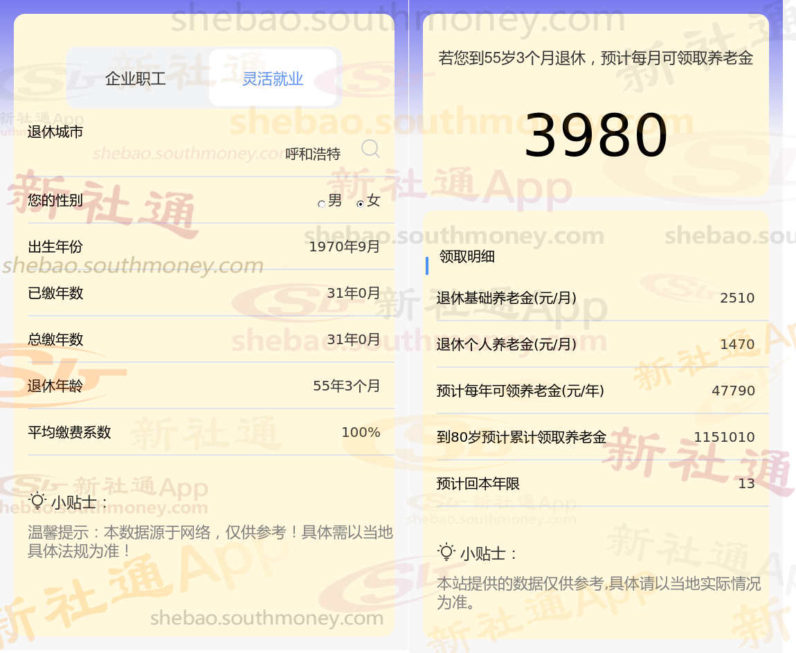 退休城市:呼和浩特,性别:女,出生年份:1970,总缴年数31年,缴费档次:100%,新社通app养老金计算器所得: