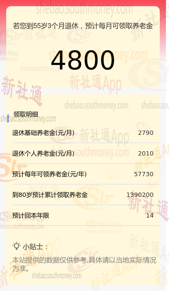 每月可领养老金=基础养老金+个人养老金≈2790+2010≈4800元。